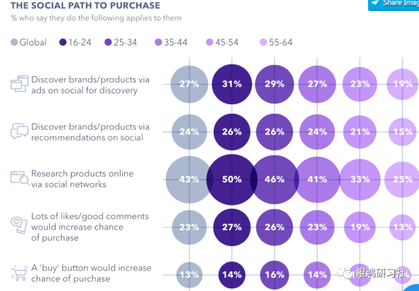 在全球范围内,社交网络现在是寻找产品和服务信息的第二渠道,社交网络慢慢取代了年轻人口中的搜索引擎,在16岁至24岁之间的互联网用户中,有一半以上表示,他们在研究产品和服务时会使用社交网络, 犹如我们在朋友圈公众号短视频等渠道获取相关的产品和行业讯息.