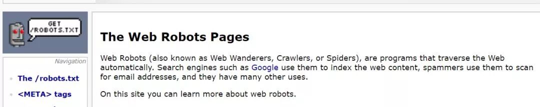 Web机器人,(也称为Web Wanderers,Crawlers或Spider)是自动搜寻网页内容的程序,Google利用robot为网页内容建立索引。