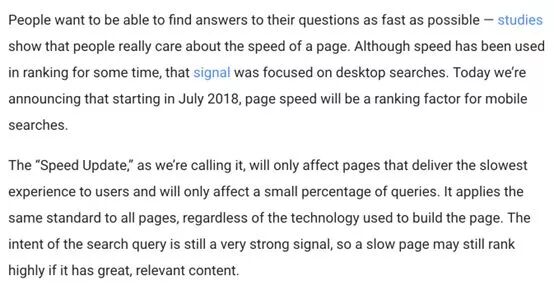 人们希望能够尽快找到问题的答案,因此网页速度十分重要。虽然速度已经用来衡量网站排名一段时间了,但这个评价标准主要应用在桌面搜索上。而从7月20日开始,页面速度将成为移动搜索的排名因素。但速度并不是唯一因素,它只会影响一小部分速度最慢的页面,与查询结果的相关性依旧是最重要的因素,因此如果一个网页和用户的需求非常相关,即使速度慢一点,排名也不会下降。