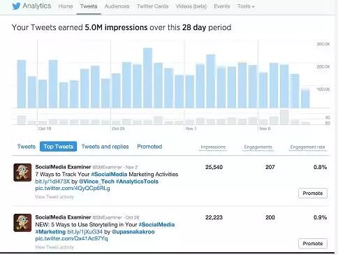 Twitter为广大用户提供了分析器功能(Twitter Analytics),在这里你可以查看近期你最热门的推文是哪几条,通过分析这几条热门推文的布局、内容等元素,你就可以获得一套好的制作推文的方式。